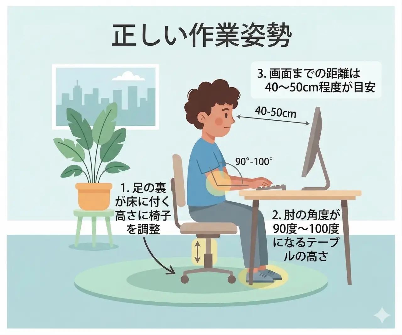 - 原因を知る:画面が低くて目線が下がる → ストレートネック。キーボードが小さくて肩が縮こまる → 猫背・巻き肩。